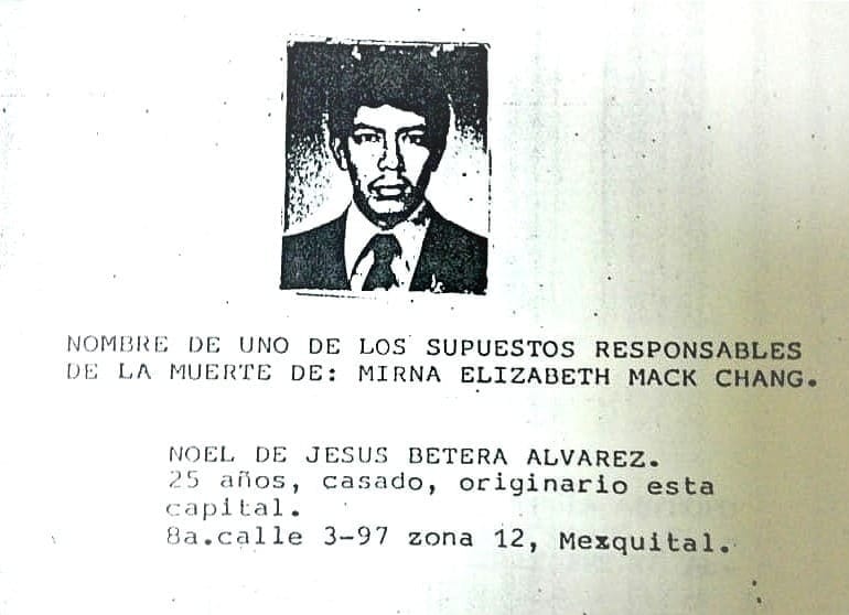 The investigator in charge of solving Myrna Mack's murder did his job. He interviewed vendors who frequented the street where she was stabbed. One of these witnesses had been a police officer and described a man he recognized: a former narcotics investigator who now worked for the Presidential General Staff. He had seen him watching 12th Street and 12th Avenue on a blue motorcycle. Mérida took note of the descriptions, which allowed for the creation of a composite sketch, and compared it to the name: Noel de Jesús Beteta Álvarez.